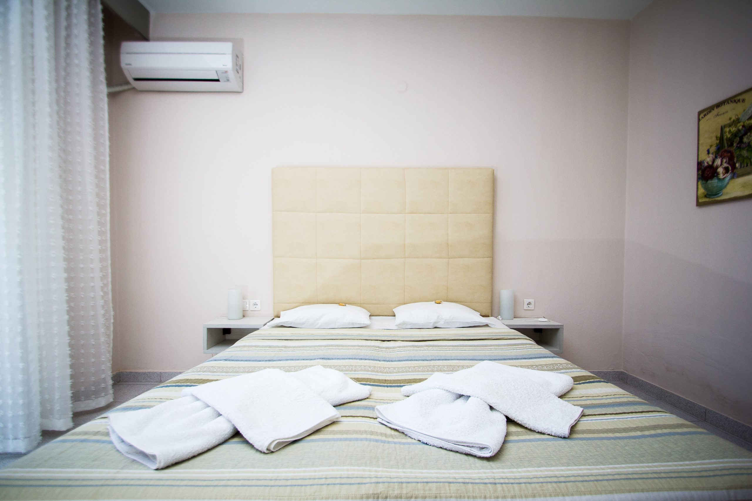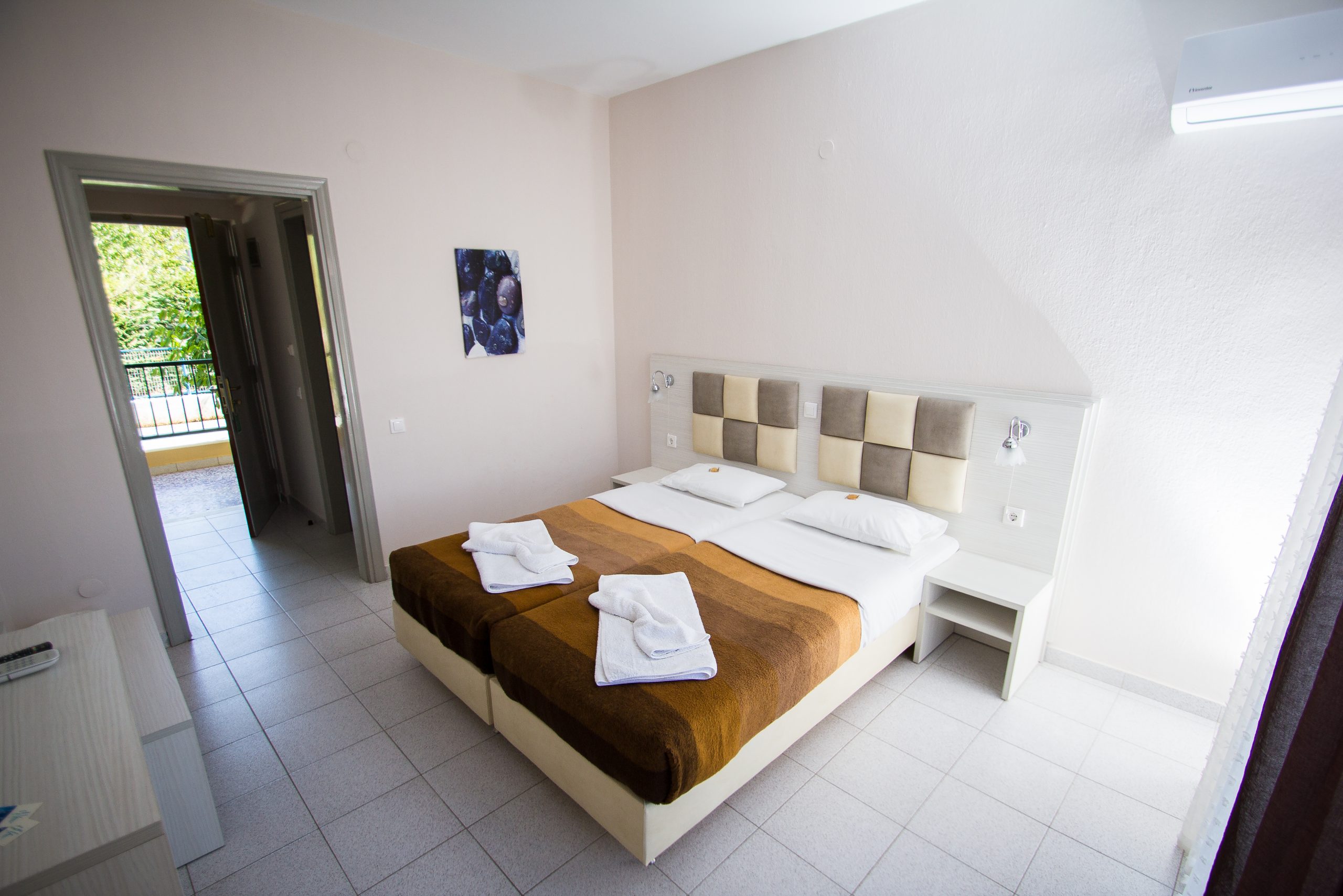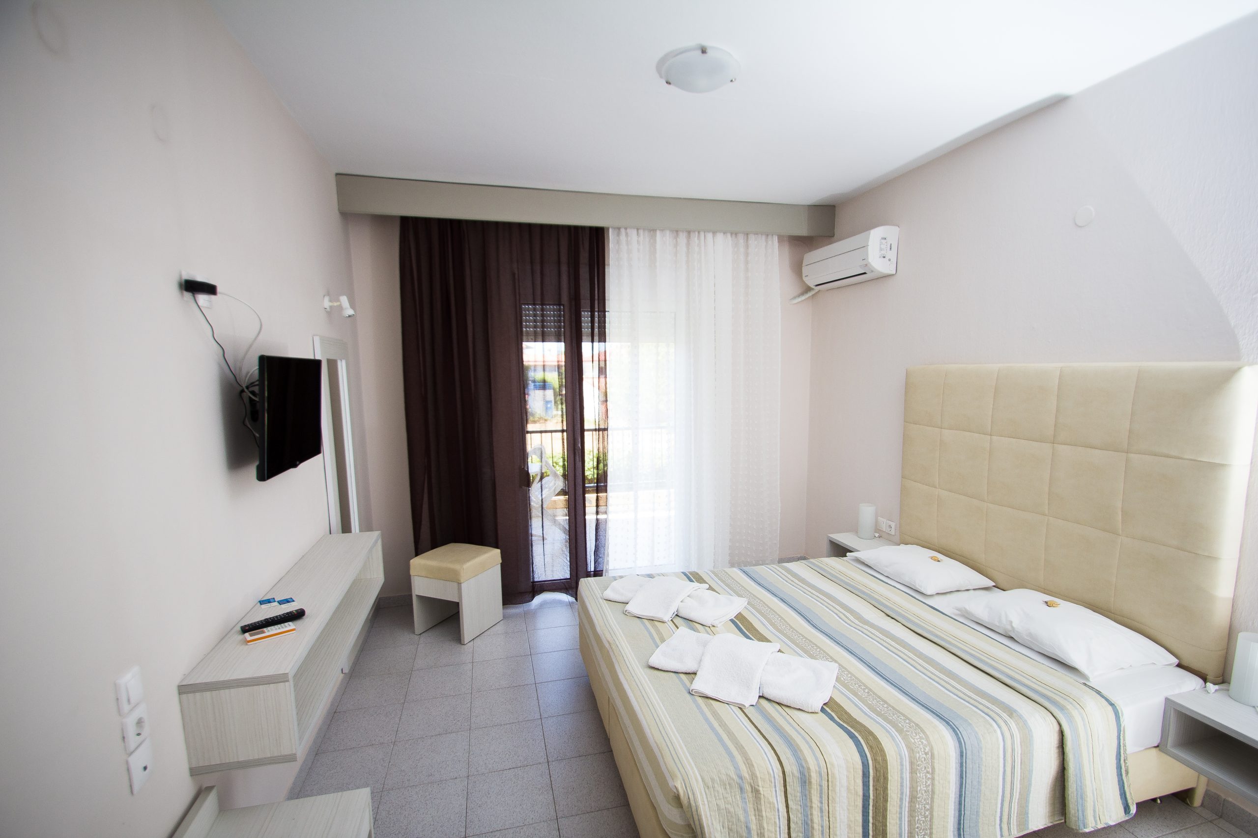 Αυτό το δίκλινο δωμάτιο (25m2) βρίσκεται στον 1ο όροφο και διαθέτει μπαλκόνι, κλιματισμό και ηλεκτρικό βραστήρα.